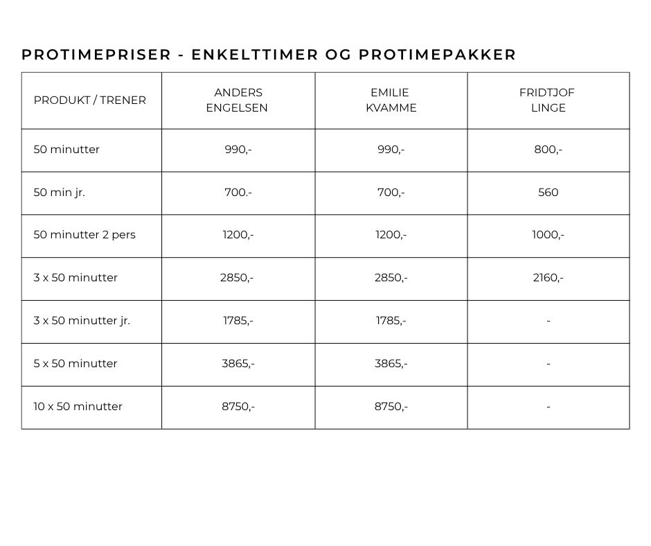 Protimer er en fin investering i din golfutvikling uavhengig av nivå. Våre trenere skreddersyr timene etter din nåsituasjon, dine mål og guider deg både teknisk og i hvordan du kan trene på best mulig måte. Vi ser frem til å hjelpe deg med å bli en bedre golfer. Du kan booke protimer (både enkelttimer og protimepakker) hos alle våre trenere.