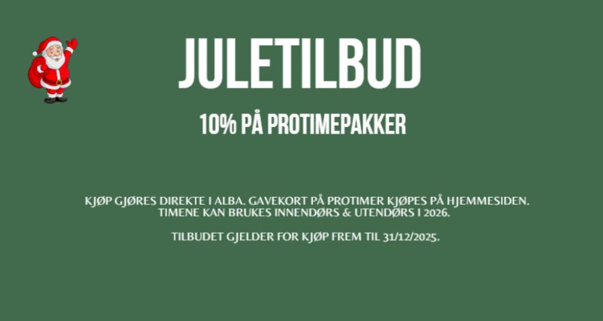 NB! I tillegg til dette kjører også våre proer juletilbud - 10% på protimepakker. Disse kan kjøpes direkte i Alba, mens gavekort på protimer kan kjøpes via hjemmesiden.